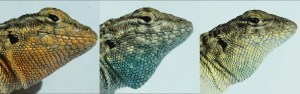 Las variantes naranja, azul y amarilla (de izquierda a derecha) del lagarto de manchas laterales (Uta stansburiana). Crédito. Ammon Corl/EFE