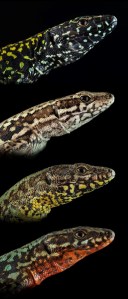 Coloración de la garganta en lagartijas comunes (Podarcis muralis). De arriba abajo: Morfo blanco con la coloración verde y negra característica del síndrome nigriventris; morfo blanco con el fenotipo marrón ancestral; morfos amarillos y naranjas de poblaciones en las que los individuos muestran una expresión variable de los caracteres. Crédito: Roberto García Roa/EFE