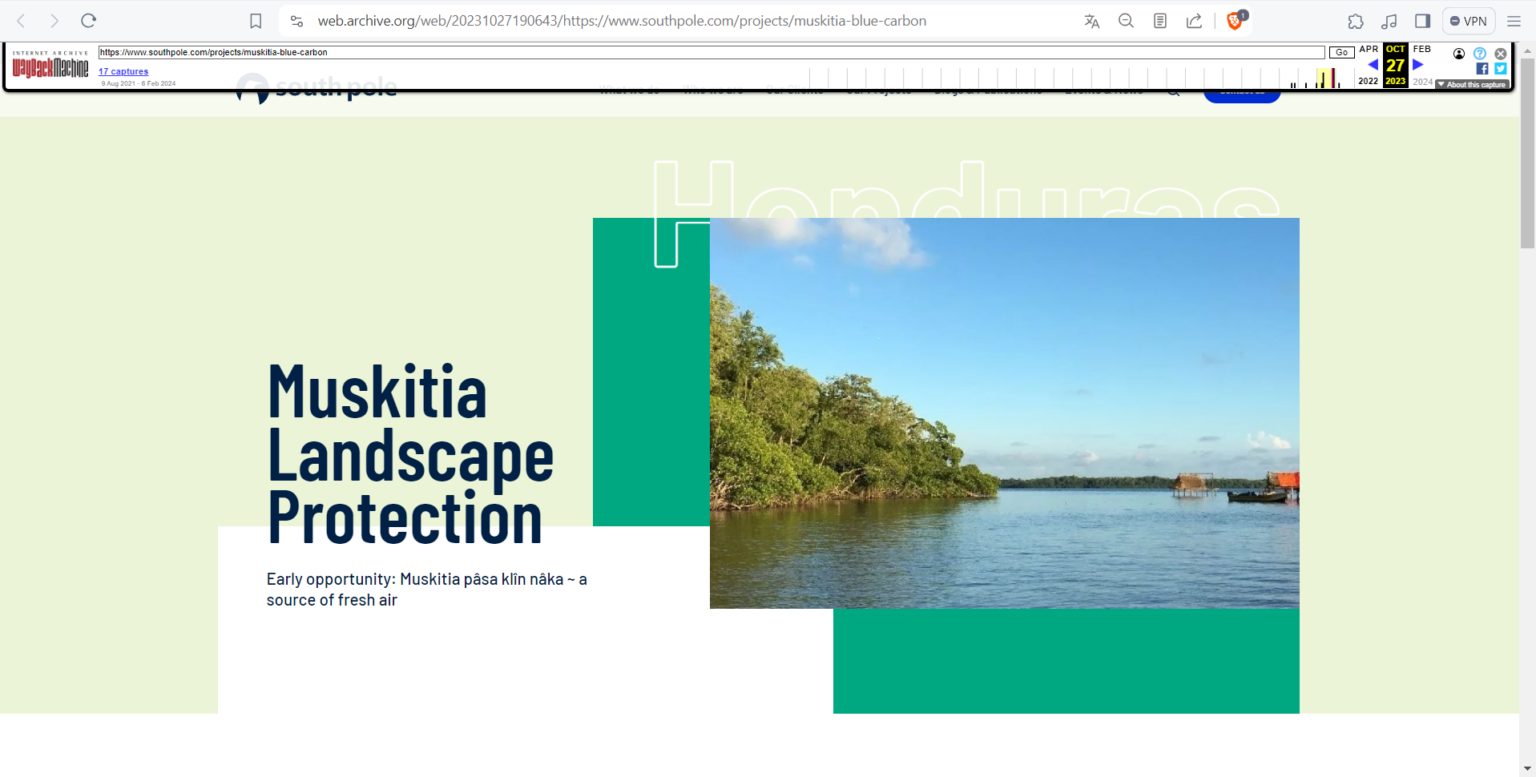 Desde mediados de 2021, el sitio web de South Pole incluía una página dedicada a esta iniciativa, a la que atribuía «nuevas oportunidades de ingresos sostenibles que no dependan de la tala del bosque» y una «infinidad de beneficios». «Para hacer frente a la deforestación y proteger los imponentes paisajes de la Muskitia, el proyecto colabora con ocho comunidades indígenas y afrohondureñas [cuyas] estructuras de gobernanza y visiones colectivas de futuro han sido fortalecidas en alianza con los concejos locales, aumentando la participación y sentando las bases para una prosperidad compartida a largo plazo», prometía.