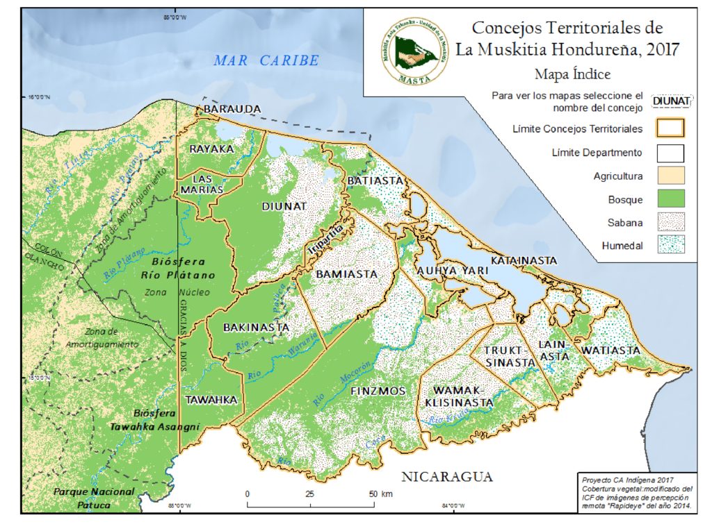 Esos nueve concejos territoriales forman parte de los 15 en los que está dividida la Moskitia hondureña, luego de un proceso de titulación de tierras que data desde 2012. Según los títulos ancestrales, la población y los líderes territoriales de cada concejo tienen el poder y uso pleno sobre el territorio. Allí conviven cuatro pueblos originarios: miskitos, pech, garífunas y tawahkas, aunque el proyecto solo abarca tierras de los dos primeros.