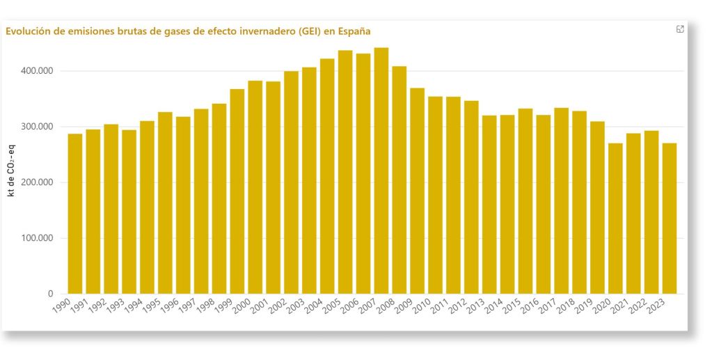 Según los datos del Ministerio para la Transición Ecológica y el Reto Demográfico, España alcanzó su máximo de emisiones en 2007 y, en 2024, las emisiones de gases de efecto invernadero eran un 6,3 % inferiores a las de 1990.
