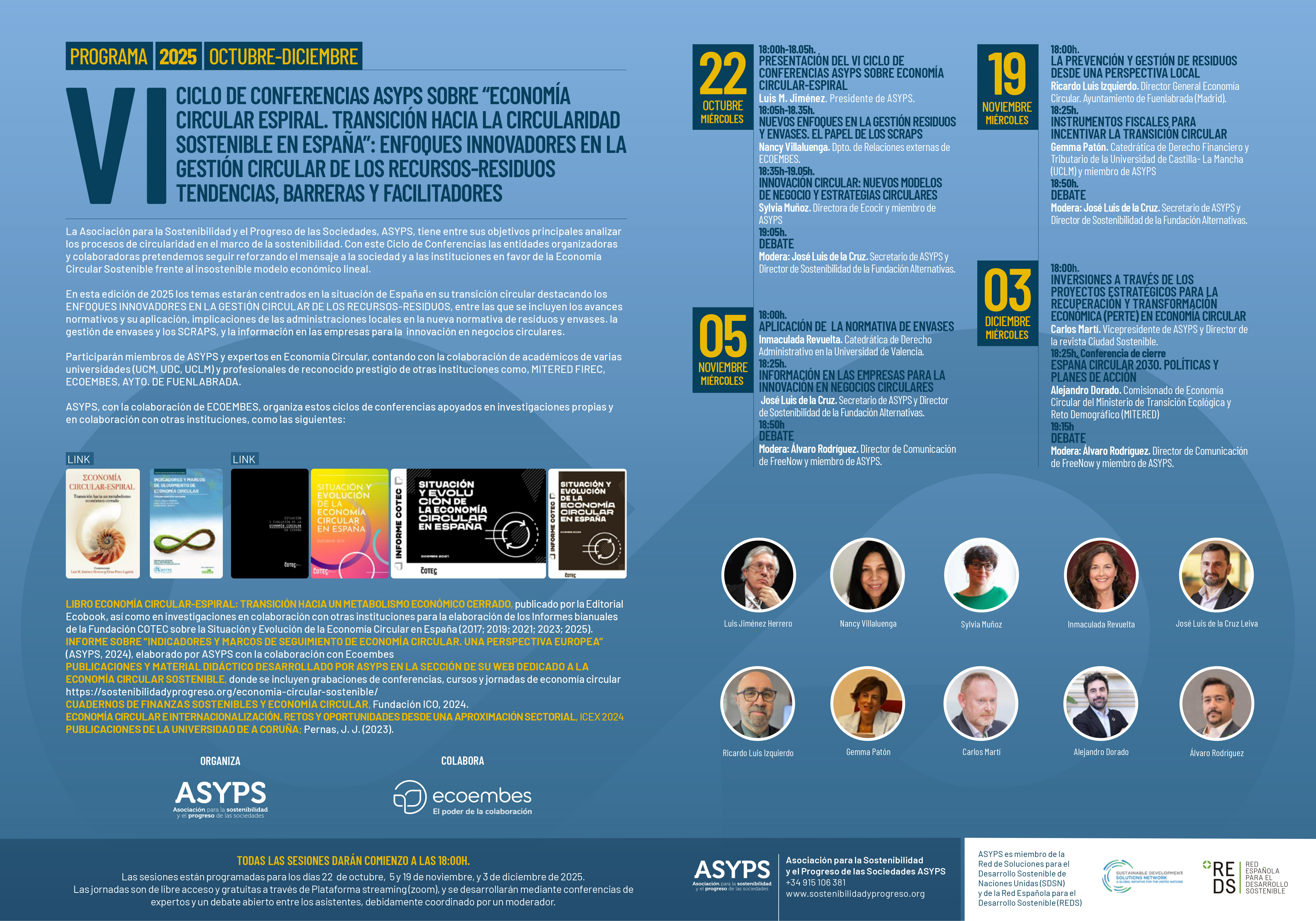 Madrid, 5 nov (EFEverde).- La aplicación de la normativa de envases será el eje central de la segunda sesión del ciclo de conferencias “Economía Circular Espiral: Transición hacia la circularidad sostenible en España”, organizado por la Asociación para la Sostenibilidad y el Progreso de las Sociedades (ASYPS) en colaboración con Ecoembes.