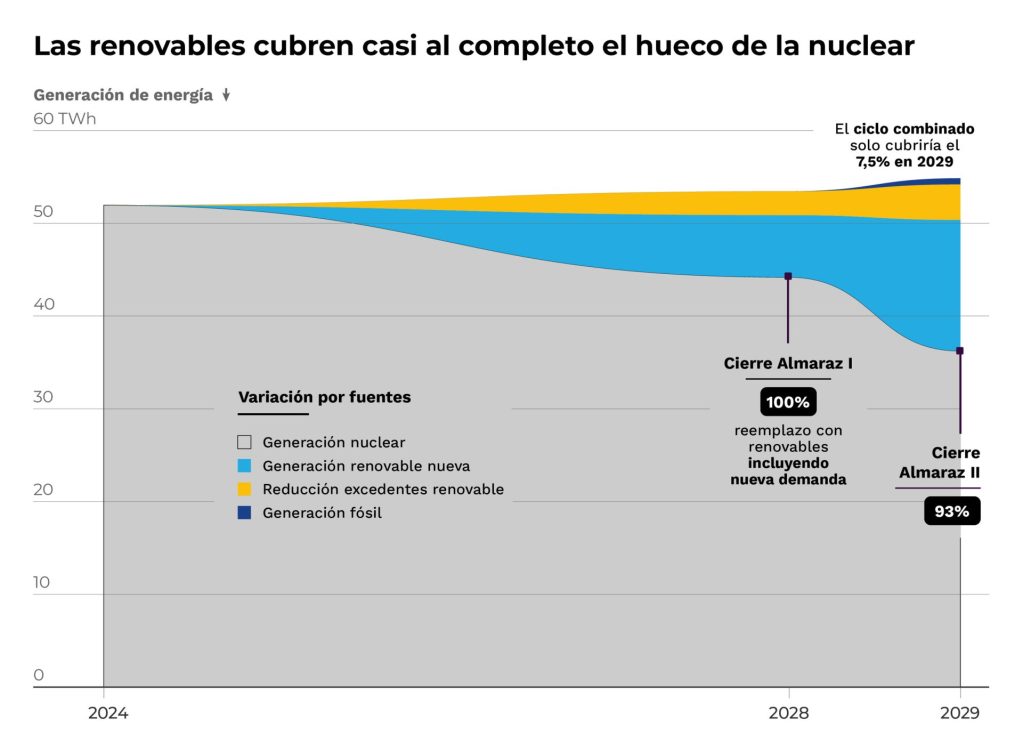 Asimismo, asegura que el cierre de Almaraz permite reducir los vertidos renovables e integrar más de 3,8 TWh anuales de energía limpia que, de otro modo, no podrían aprovecharse.
