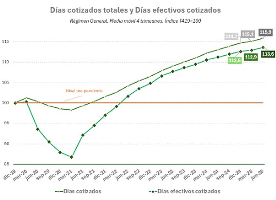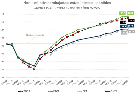 En cuanto al indicador de horas cotizadas, la TGSS también ha publicado los últimos datos, correspondientes al segundo trimestre de 2025. Para evitar la volatilidad que existe entre los diferentes trimestres y apreciar la evolución a medio plazo de las horas efectivas trabajadas, se incluye un índice basado en la media móvil de cuatro trimestres. En el segundo trimestre de 2025 en 13,1 puntos, siendo 100 el dato de referencia correspondiente al último trimestre de 2019 (fecha de referencia, de niveles prepandemia, si se comparan los datos de cada uno de estos trimestres); lo que significa que las horas efectivas trabajadas han experimentado un incremento del 13,1% respecto al nivel previo a la pandemia.