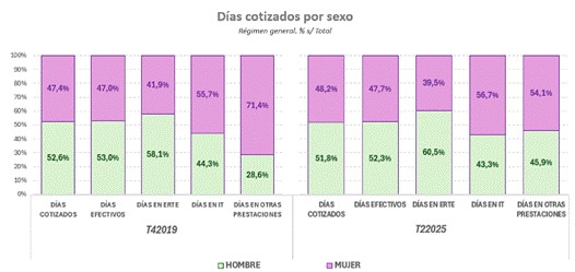 Esta información se calcula a partir de los registros de afiliación y de los informes de las bases de cotización que posee la Tesorería General de la Seguridad Social (TGSS).  En el caso de los días cotizados, los datos se calculan a partir de la serie temporal que registra la TGSS y que se inicia en enero de 2019, que ofrece una desagregación por sexo, sección de actividad y tipo de contrato.