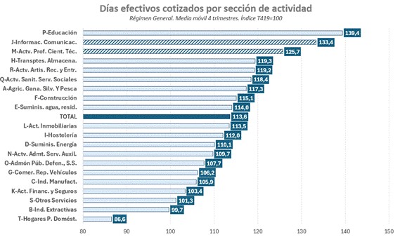 Por secciones de actividad, las de alto valor añadido lideran el crecimiento de días efectivos desde 2019, antes de la pandemia. En Educación, los días efectivos cotizados han aumentado por encima de la media (+39,4% en total), mientras que en Información y Comunicaciones y Actividades Profesionales, Científicas y Técnicas han crecido más del 33,4% y 25,7%, respectivamente.