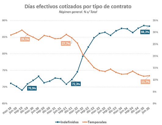 Sin embargo, en el segundo trimestre de 2025, estos porcentajes se invierten. Tal es así que los contratos indefinidos suponen ya el 88,3% del total de días cotizados; mientras que el 11,7% restante corresponde a contratos temporales.